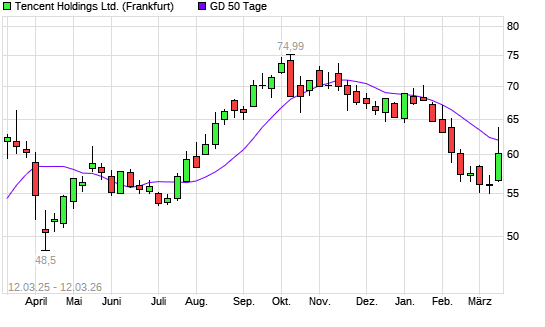 Mit dem Rücksetzer auf 61,46 EUR hat die Tencent-Aktie am 11.03.2026 die 50-Tage-Linie nach unten gekreuzt.