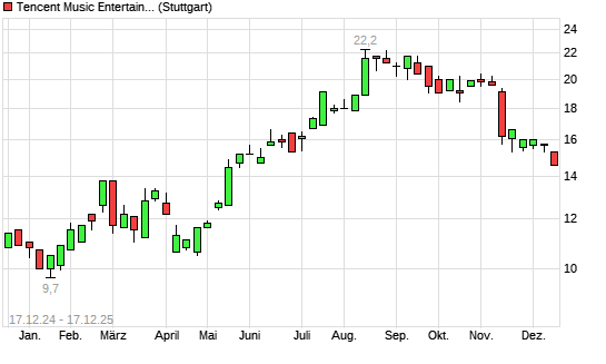 Mit dem Rücksetzer auf 14,60 EUR hat die Tencent Music Entertainment-Aktie (ISIN US88034P1093) am 16.12.2025 ein neues 6-Monats-Tief erreicht und damit den Kurs vom 21.11.2025 eingestellt.