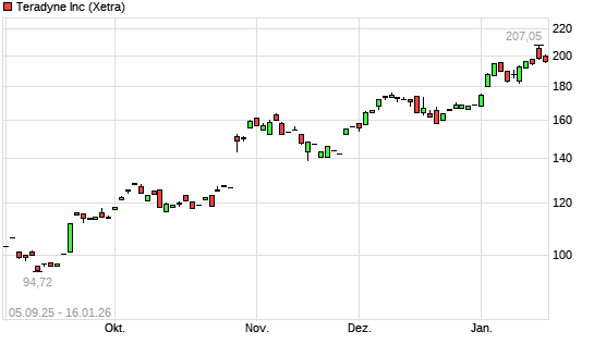 Mit dem Anstieg auf 198,38 EUR hat die Teradyne-Aktie (ISIN US8807701029) am 15.01.2026 ein neues All-Time-High erreicht und damit den Kurs vom 06.01.2026 eingestellt.
