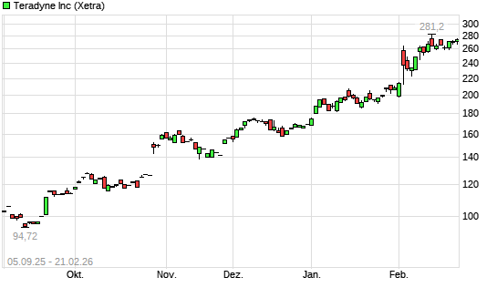 Mit dem Anstieg auf 275,40 EUR hat die Teradyne-Aktie (ISIN US8807701029) am 20.02.2026 ein neues All-Time-High erreicht und damit den Kurs vom 18.02.2026 eingestellt.