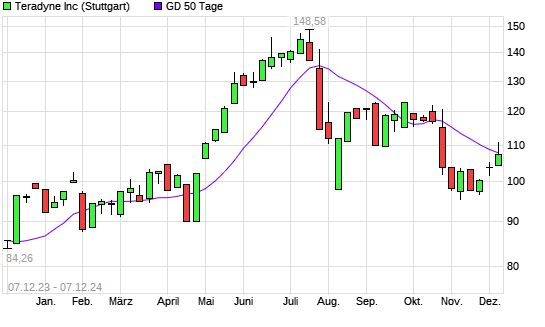 Mit dem Rücksetzer auf 106,16 EUR hat die Teradyne-Aktie am 06.12.2024 die 50-Tage-Linie nach unten gekreuzt.