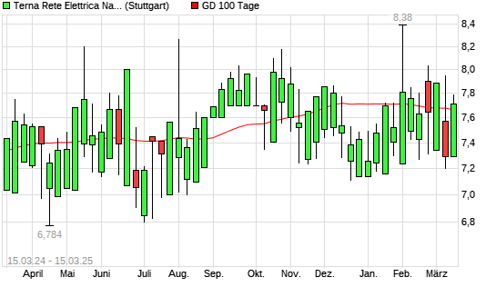 Mit dem Rücksetzer auf 7,76 EUR hat die Terna-Aktie am 14.03.2025 die 100-Tage-Linie nach unten gekreuzt.