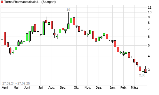 Mit dem Rücksetzer auf 2,84 EUR hat die Terns Pharmaceuticals-Aktie (ISIN US8808811074) am 26.03.2025 ein neues 12-Monats-Tief erreicht und damit den Kurs vom 18.03.2025 eingestellt.