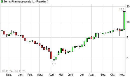 Mit dem Anstieg auf 15,70 EUR hat die Terns Pharmaceuticals-Aktie (ISIN US8808811074) am 05.11.2025 ein neues 3-Jahres-Hoch erreicht und damit den Kurs vom 04.11.2025 eingestellt.