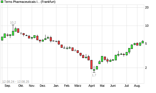 Mit dem Anstieg auf 5,40 EUR hat die Terns Pharmaceuticals-Aktie (ISIN US8808811074) am 11.08.2025 ein neues 6-Monats-Hoch erreicht und damit den Kurs vom 05.08.2025 eingestellt.