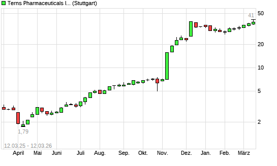Mit dem Anstieg auf 40,00 EUR hat die Terns Pharmaceuticals-Aktie (ISIN US8808811074) am 11.03.2026 ein neues All-Time-High erreicht und damit den Kurs vom 11.12.2025 eingestellt.