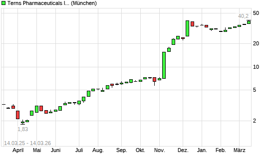 Mit dem Anstieg auf 40,60 EUR hat die Terns Pharmaceuticals-Aktie (ISIN US8808811074) am 13.03.2026 ein neues All-Time-High erreicht und damit den Kurs vom 11.03.2026 eingestellt.