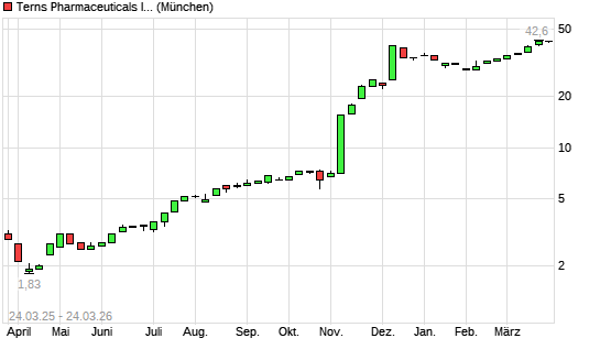 Mit dem Anstieg auf 42,20 EUR hat die Terns Pharmaceuticals-Aktie (ISIN US8808811074) am 23.03.2026 ein neues All-Time-High erreicht und damit den Kurs vom 20.03.2026 eingestellt.