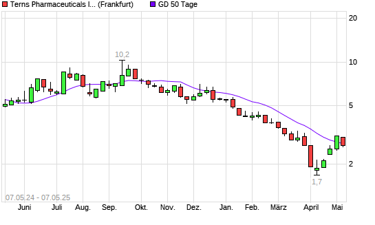 Mit dem Rücksetzer auf 2,62 EUR hat die Terns Pharmaceuticals-Aktie am 06.05.2025 die 50-Tage-Linie nach unten gekreuzt.