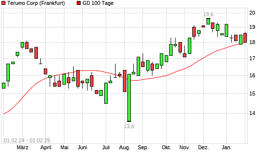 Mit dem Rücksetzer auf 18,00 EUR hat die Terumo-Aktie am 31.01.2025 die 100-Tage-Linie nach unten gekreuzt.