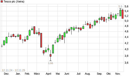 Mit dem Anstieg auf 5,50 EUR hat die Tesco-Aktie (ISIN GB00BLGZ9862) am 11.11.2025 ein neues 10-Jahres-Hoch erreicht und damit den Kurs vom 06.11.2025 eingestellt.