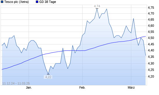 Mit dem Anstieg auf 4,54 EUR hat die Tesco-Aktie am 10.03.2025 die 38-Tage-Linie nach oben gekreuzt.