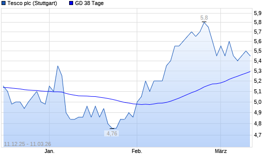 Mit dem Anstieg auf 5,40 EUR hat die Tesco-Aktie am 10.03.2026 die 38-Tage-Linie nach oben gekreuzt.