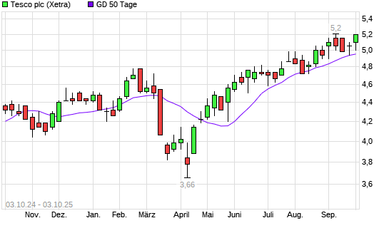 Mit dem Anstieg auf 5,20 EUR hat die Tesco-Aktie am 02.10.2025 die 50-Tage-Linie nach oben gekreuzt.