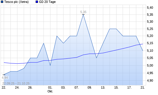 Mit dem Rücksetzer auf 5,10 EUR hat die Tesco-Aktie am 20.10.2025 die 20-Tage-Linie nach unten gekreuzt.