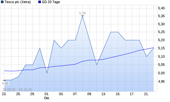 Mit dem Rücksetzer auf 5,10 EUR hat die Tesco-Aktie am 22.10.2025 die 20-Tage-Linie nach unten gekreuzt.