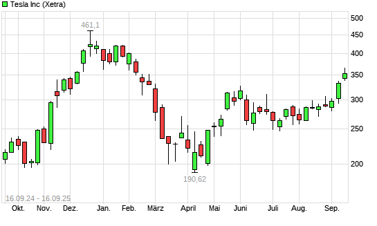 Mit dem Anstieg auf 348,00 EUR hat die Tesla-Aktie (ISIN US88160R1014) am 15.09.2025 ein neues 6-Monats-Hoch erreicht und damit den Kurs vom 12.09.2025 eingestellt.