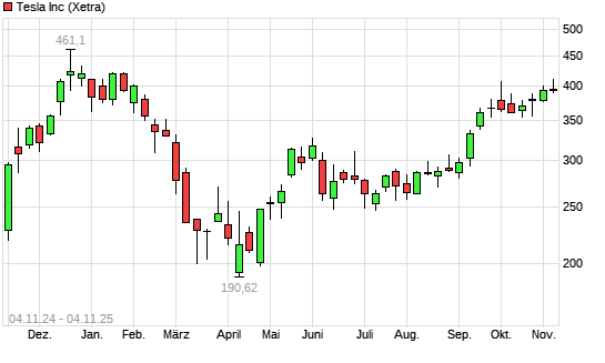 Mit dem Anstieg auf 407,00 EUR hat die Tesla-Aktie (ISIN US88160R1014) am 03.11.2025 ein neues 6-Monats-Hoch erreicht und damit den Kurs vom 29.10.2025 eingestellt.