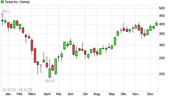 Mit dem Anstieg auf 408,00 EUR hat die Tesla-Aktie (ISIN US88160R1014) am 15.12.2025 ein neues 6-Monats-Hoch erreicht und damit den Kurs vom 03.11.2025 eingestellt.