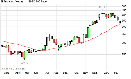 Mit dem Rücksetzer auf 316,15 EUR hat die Tesla-Aktie am 11.02.2025 die 100-Tage-Linie nach unten gekreuzt.