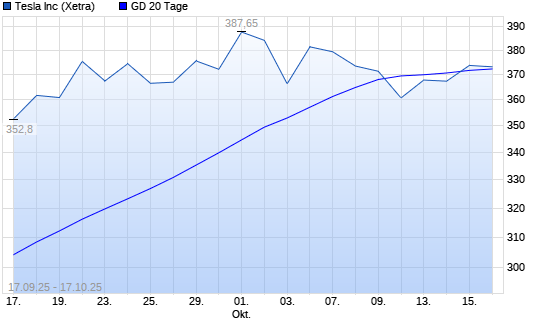 Mit dem Rücksetzer auf 361,65 EUR hat die Tesla-Aktie am 16.10.2025 die 20-Tage-Linie nach unten gekreuzt.