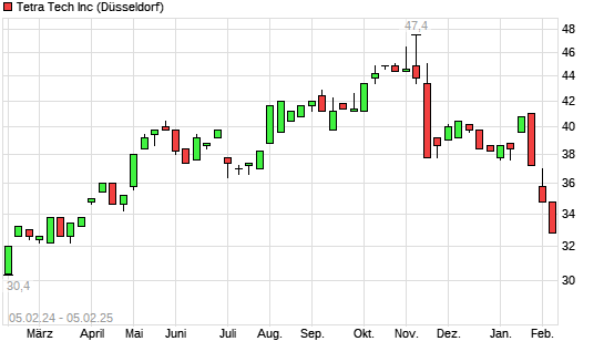 Mit dem Rücksetzer auf 32,60 EUR hat die Tetra Tech-Aktie (ISIN US88162G1031) am 04.02.2025 ein neues 6-Monats-Tief erreicht und damit den Kurs vom 30.01.2025 eingestellt.