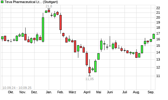 Mit dem Anstieg auf 16,50 EUR hat die Teva Pharmaceutical ADR-Aktie (ISIN US8816242098) am 09.09.2025 ein neues 6-Monats-Hoch erreicht und damit den Kurs vom 22.08.2025 eingestellt.