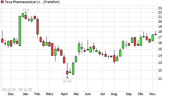 Mit dem Anstieg auf 17,70 EUR hat die Teva Pharmaceutical ADR-Aktie (ISIN US8816242098) am 03.11.2025 ein neues 6-Monats-Hoch erreicht und damit den Kurs vom 09.10.2025 eingestellt.