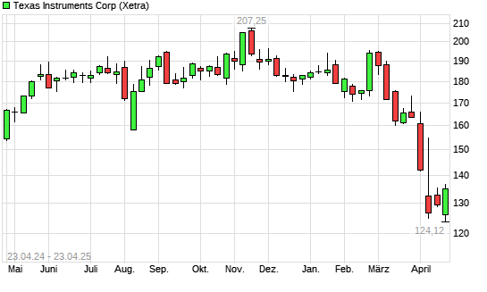 Mit dem Rücksetzer auf 125,24 EUR hat die Texas Instruments-Aktie (ISIN US8825081040) am 22.04.2025 ein neues 3-Jahres-Tief erreicht und damit den Kurs vom 16.04.2025 eingestellt.