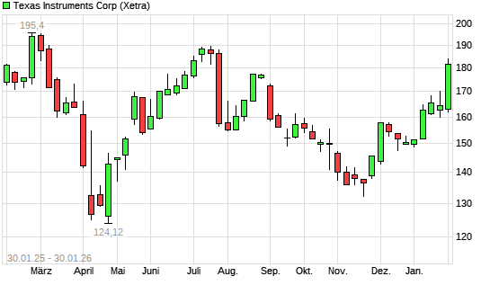 Mit dem Anstieg auf 183,34 EUR hat die Texas Instruments-Aktie (ISIN US8825081040) am 29.01.2026 ein neues 6-Monats-Hoch erreicht und damit den Kurs vom 28.01.2026 eingestellt.