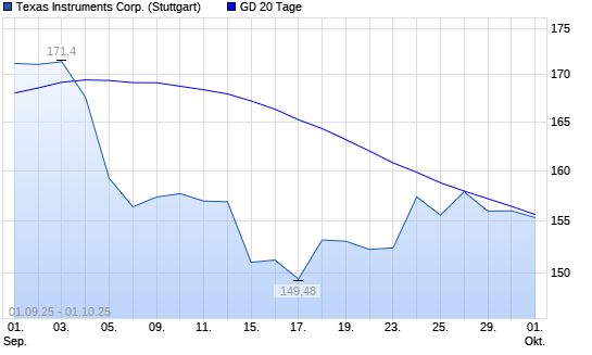 Mit dem Rücksetzer auf 156,14 EUR hat die Texas Instruments-Aktie am 30.09.2025 die 20-Tage-Linie nach unten gekreuzt.