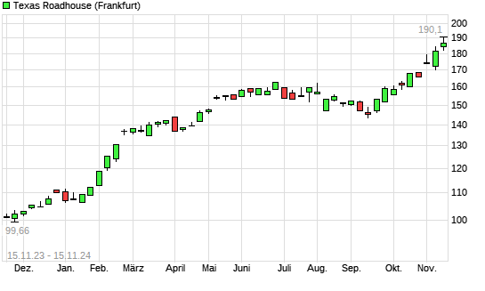 Mit dem Anstieg auf 188,70 EUR hat die Texas Roadhouse-Aktie (ISIN US8826811098) am 14.11.2024 ein neues All-Time-High erreicht und damit den Kurs vom 11.11.2024 eingestellt.