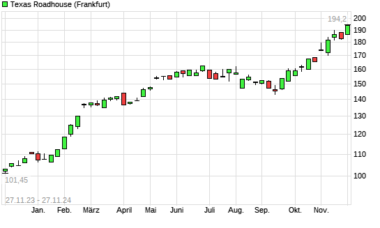 Mit dem Anstieg auf 192,15 EUR hat die Texas Roadhouse-Aktie (ISIN US8826811098) am 26.11.2024 ein neues All-Time-High erreicht und damit den Kurs vom 14.11.2024 eingestellt.