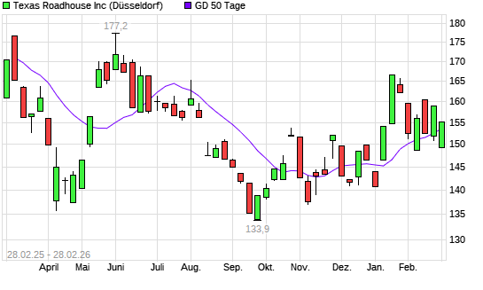 Mit dem Anstieg auf 155,20 EUR hat die Texas Roadhouse-Aktie am 27.02.2026 die 50-Tage-Linie nach oben gekreuzt.