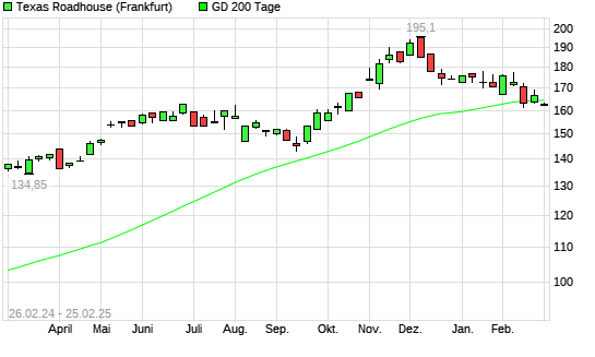 Mit dem Rücksetzer auf 160,85 EUR hat die Texas Roadhouse-Aktie am 24.02.2025 die 200-Tage-Linie nach unten gekreuzt.