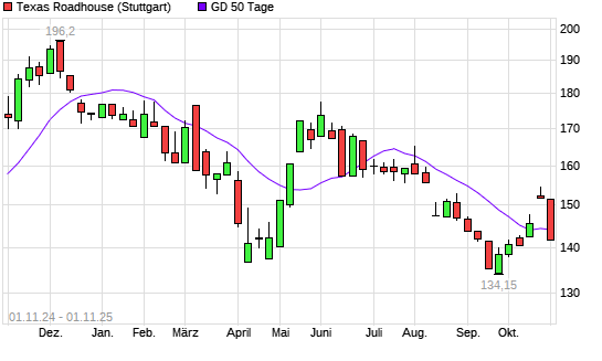Mit dem Rücksetzer auf 142,75 EUR hat die Texas Roadhouse-Aktie am 31.10.2025 die 50-Tage-Linie nach unten gekreuzt.