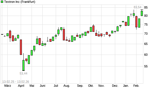 Mit dem Anstieg auf 83,08 EUR hat die Textron-Aktie (ISIN US8832031012) am 12.02.2026 ein neues 12-Monats-Hoch erreicht und damit den Kurs vom 22.01.2026 eingestellt.