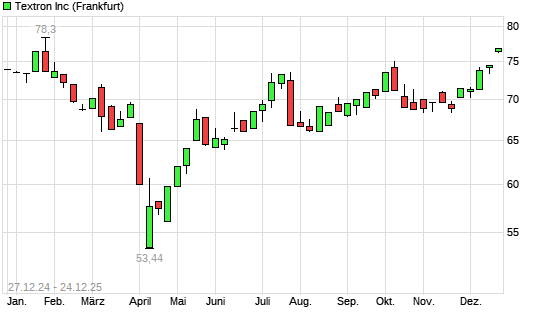 Textron ist Teil des 737 Titel umfassenden Anlageuniversum der boerse.de-Signale Aktien USA. In der großen Trendauswertung vom 26.12.2025 ist der Titel von Rang 278 auf Rang 256 aufgestiegen.Gesteuert ...weiterlesen