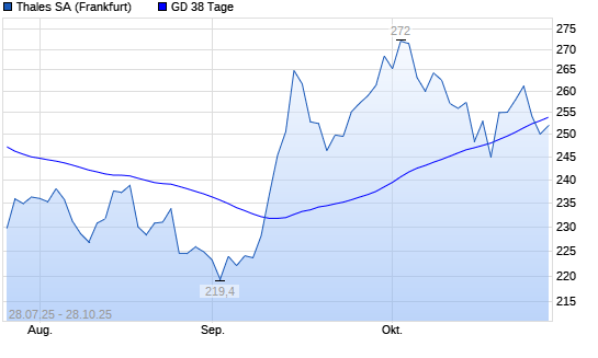 Mit dem Rücksetzer auf 250,10 EUR hat die Thales-Aktie am 27.10.2025 die 38-Tage-Linie nach unten gekreuzt.