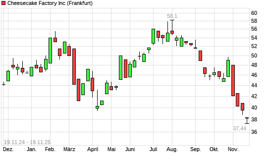 Mit dem Rücksetzer auf 37,44 EUR hat die The Cheesecake Factory-Aktie (ISIN US1630721017) am 18.11.2025 ein neues 12-Monats-Tief erreicht und damit den Kurs vom 17.11.2025 eingestellt.