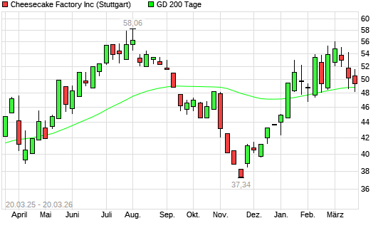 Mit dem Rücksetzer auf 48,30 EUR hat die The Cheesecake Factory-Aktie am 19.03.2026 die 200-Tage-Linie nach unten gekreuzt.