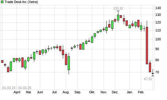 Mit dem Rücksetzer auf 67,42 EUR hat die The Trade Desk-Aktie (ISIN US88339J1051) am 28.02.2025 ein neues 12-Monats-Tief erreicht und damit den Kurs vom 27.02.2025 eingestellt.