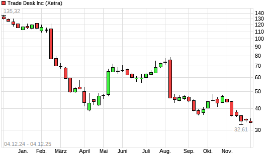 Mit dem Rücksetzer auf 33,07 EUR hat die The Trade Desk-Aktie (ISIN US88339J1051) am 03.12.2025 ein neues 5-Jahres-Tief erreicht und damit den Kurs vom 20.11.2025 eingestellt.