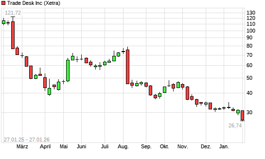 Mit dem Rücksetzer auf 28,49 EUR hat die The Trade Desk-Aktie (ISIN US88339J1051) am 26.01.2026 ein neues 5-Jahres-Tief erreicht und damit den Kurs vom 20.01.2026 eingestellt.