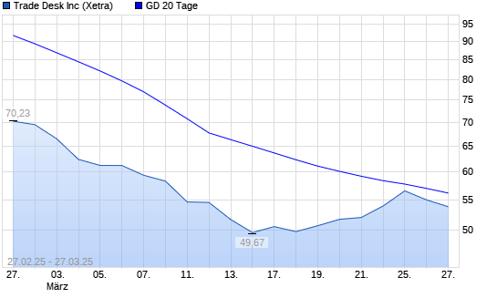Mit dem Rücksetzer auf 54,46 EUR hat die The Trade Desk-Aktie am 26.03.2025 die 20-Tage-Linie nach unten gekreuzt.