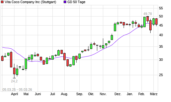 Mit dem Anstieg auf 46,38 EUR hat die The Vita Coco Company-Aktie am 04.03.2026 die 50-Tage-Linie nach oben gekreuzt.