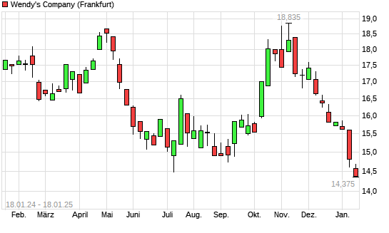 Mit dem Rücksetzer auf 14,25 EUR hat die The Wendy's Company-Aktie (ISIN US95058W1009) am 17.01.2025 ein neues 3-Jahres-Tief erreicht und damit den Kurs vom 16.01.2025 eingestellt.