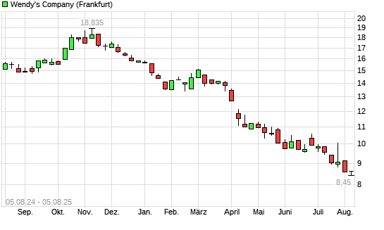 Mit dem Rücksetzer auf 8,54 EUR hat die The Wendy's Company-Aktie (ISIN US95058W1009) am 04.08.2025 ein neues 5-Jahres-Tief erreicht und damit den Kurs vom 01.08.2025 eingestellt.