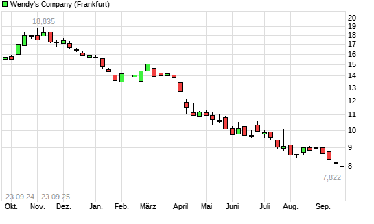 Mit dem Rücksetzer auf 7,91 EUR hat die The Wendy's Company-Aktie (ISIN US95058W1009) am 22.09.2025 ein neues 5-Jahres-Tief erreicht und damit den Kurs vom 19.09.2025 eingestellt.