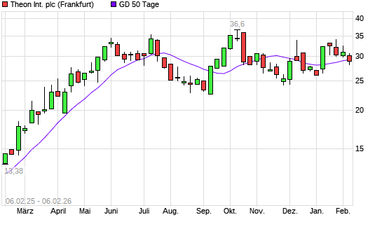 Mit dem Rücksetzer auf 29,00 EUR hat die Theon International-Aktie am 05.02.2026 die 50-Tage-Linie nach unten gekreuzt.